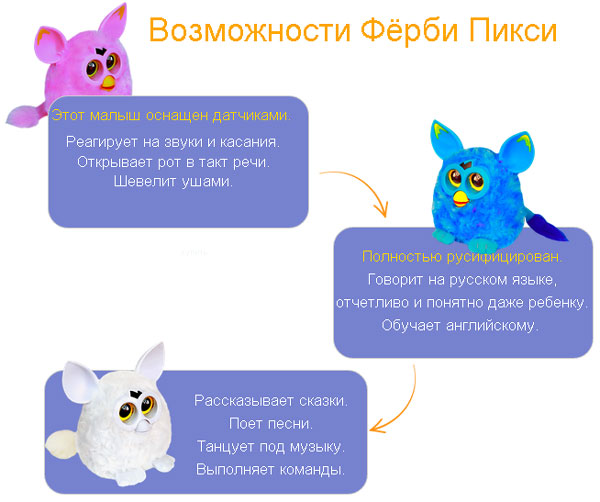 Ферби по кличке Пикси - это отличная развивающая игрушка, которая учит ребенка русским и английским фразам, поет, танцует, воспроизводит мелодии и поддерживает интеллектуальную беседу. Ферби имеет встроенные датчики движения, что позволяет ей реагировать на прикосновения и поглаживания, а также динамики, благодаря которым она может издавать различные звуки. При общении игрушка двигает ротиком и шевелит ушками. При отсутствии взаимодействия – переходит в спящий режим и выключается.