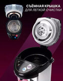 Верхнюю крышку очень легко снять и помыть прибор изнутри, а как это сделать удобнее всего описано в инструкции, которая идёт в комплекте. Встроенная шкала поможет вам всегда контролировать уровень воды, не заглядывая во внутрь термопота. Встроенная ручка позволит вам более удобно переносить термопот с места на место.